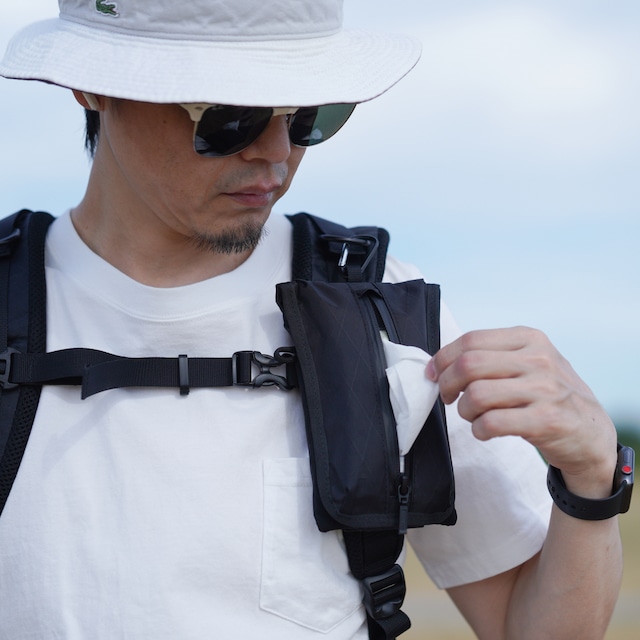 SHOONIE(シューニィ)のバックパックやリュックのショルダーハーネスに装着するスマートフォンポーチです。 登山・サイクリング・アウトドア・など様々なシーンで活躍します。 iPhone16やiPhoneSEサイズのスマートフォンをお使いの方におすすめです。 ボディは軽量で高い耐水性を持ったX-Pacを使用。 取り付けは、バックパックやリュックのショルダーハーネスに簡単に取り付け。 クリップとベルクロの両方に対応。クリップは、幅20~25mmのテープに通して使用できます。 フラップには止水ファスナーを使ったポケットティッシュや小物を収納できる便利なポケットがあります。 また、カラビナや鍵を掛けるループ、イヤホンなど小物を収納できるストレッチポケットも完備しています。 モデル:フォンポーチプラスTypeM サイズ:W11xH16xD4cm 重量:約79g(クリップ/ベルクロ装着時で±0.5g差あり) カラー:ブラック 素材:ボディ(X-Pac VX21) ライニング(420d防水コーティングナイロン) 付属品:カラビナ、クリップ、ベルクロテープ 製造:日本 Q1.どのようなバッグにおすすめですか? A1.バックパックやメッセンジャーバッグなど様々なバッグにお使いいただけます。ベルクロ固定の場合はカラビナを使うとしっかり固定できます。クリップは20~25mm幅のテープに対応しています。 Q2.ポーチの素材は何ですか? A2.表地は軽量で耐水性の高いX-Pac VX21を使用。裏地には420D防水加工ナイロンを使用しています。 Q3.付属品はありますか? A3.ベルクロ固定時に使用するカラビナ1個・ベルクロストラップ2本とクリップ2個が付属します。 Q4.お手入れ方法は? A4.ひどい汚れは中性洗剤で優しく手洗いし、しっかり乾燥させてください。洗濯機や乾燥機は使用しないでください。 Q5.修理はできますか? A5.ほぼ全ての修理対応が可能ですのでまずはお気軽にご相談ください。 Q6.ポーチは防水ですか? A6.完全防水ではありませんが生地には耐水性の高いX-Pacを使用していますので、小雨程度なら問題なくお使いいただけます。 iPhone16ProMaxなどの大きい機種や手帳型ケースをお使いの方はこちら https://www.shoonie.jp/items/77107727 *カスタムのご相談はカスタムオーダーの色見本をご確認のうえ、備考欄にご記載ください。 内容確認のためご連絡いたします。ご返信後に製作開始となります。 ▶︎カスタムオーダーの色見本はこちらから https://www.shoonie.jp/items/61914593 *在庫のないカラーの場合、取り寄せのため通常よりお時間をいただく場合があります。 最短1~2日で発送いたします。 *予期せず仕様変更する場合が御座います。ご了承ください。