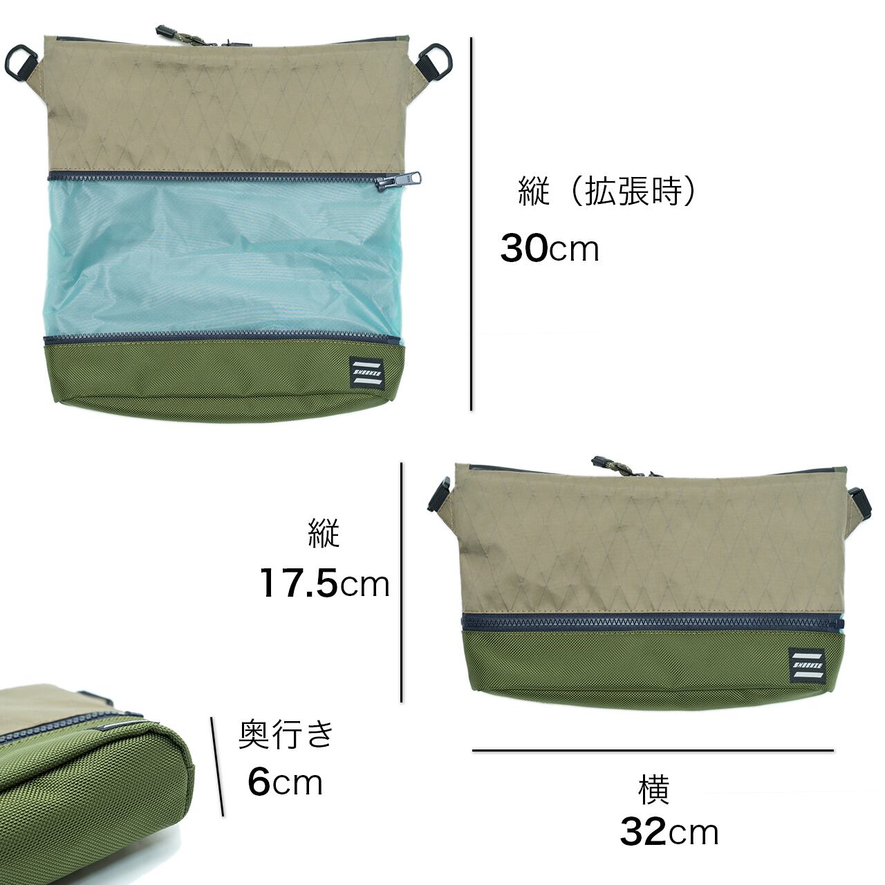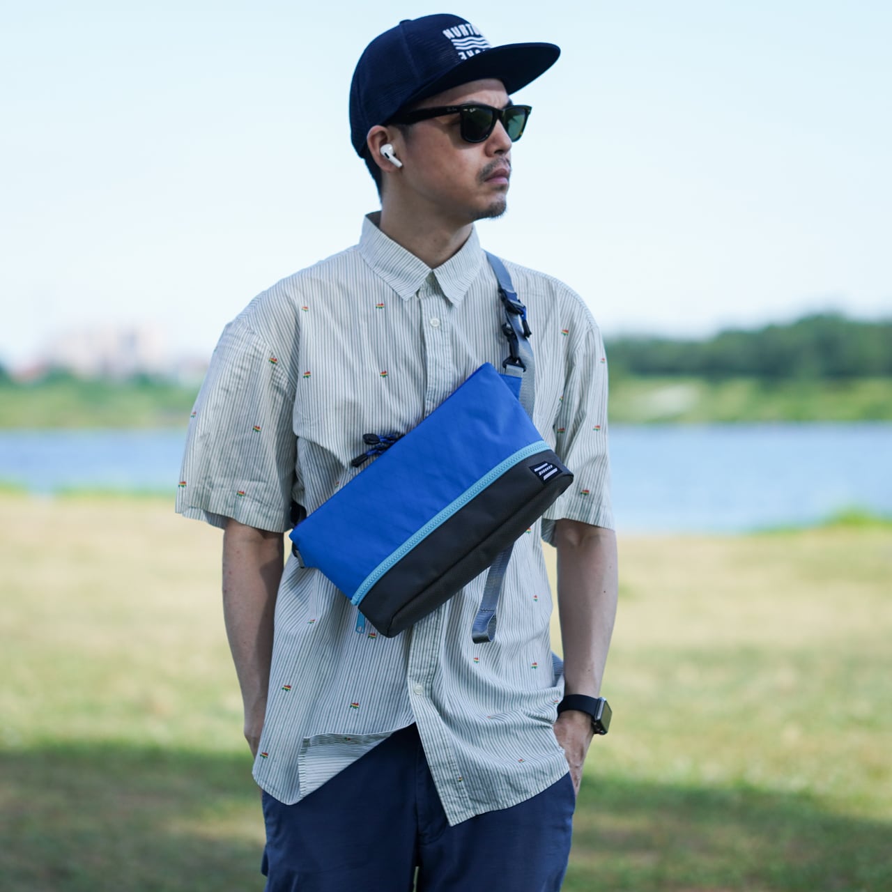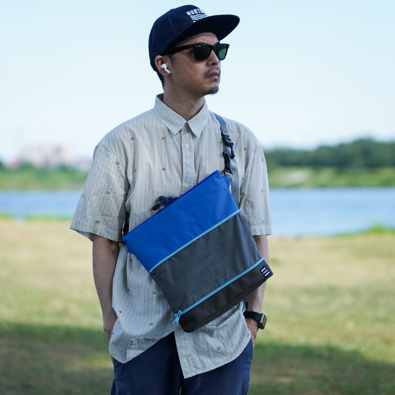 SHOONIE(シューニィ)のFXサコッシュは軽量・耐水のX-Pacを使用し、ボディ中央のファスナーで素早く荷室を拡張でき、普段使いからアウトドア・サイクリングまで幅広いシーンで活躍します。